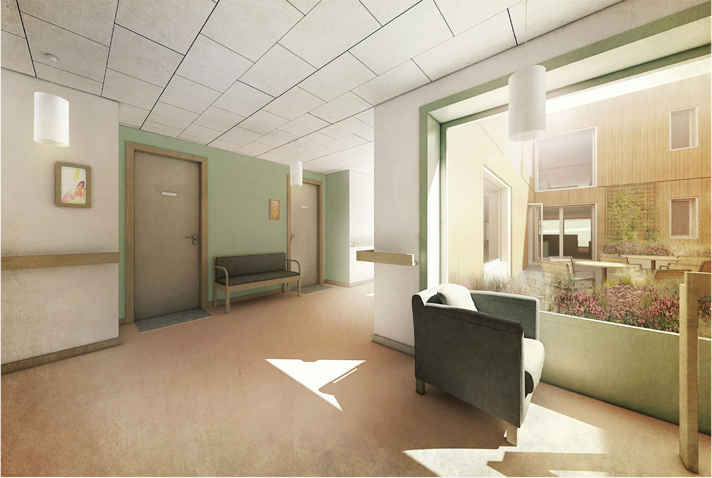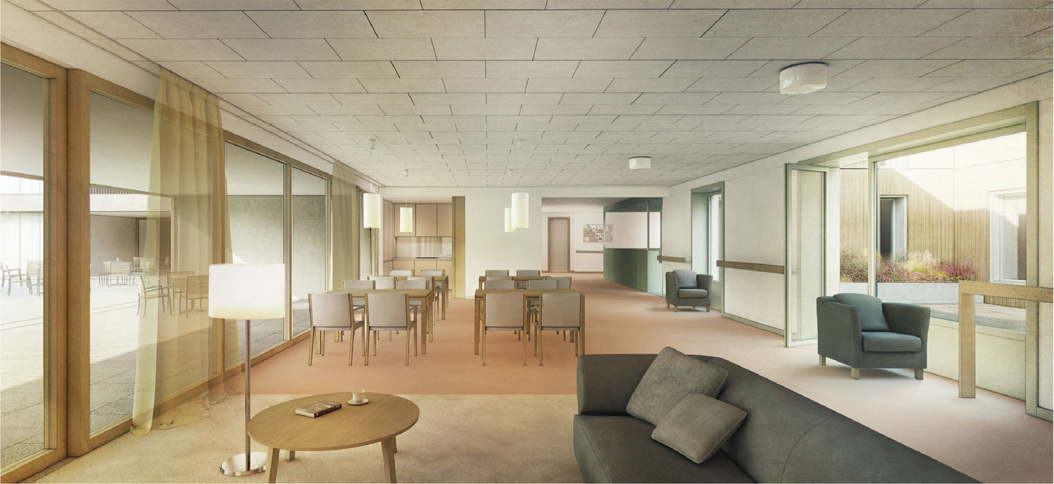 Budova bude navržena tak, aby nepůsobila institucionálně – spíše jako malé městečko s náměstíčkem, uličkami a zákoutími, kde se obyvatelé mohou potkávat i uchýlit do soukromí. Interiér doplní atria s přirozeným světlem, společné prostory i dostatečné zázemí pro personál.