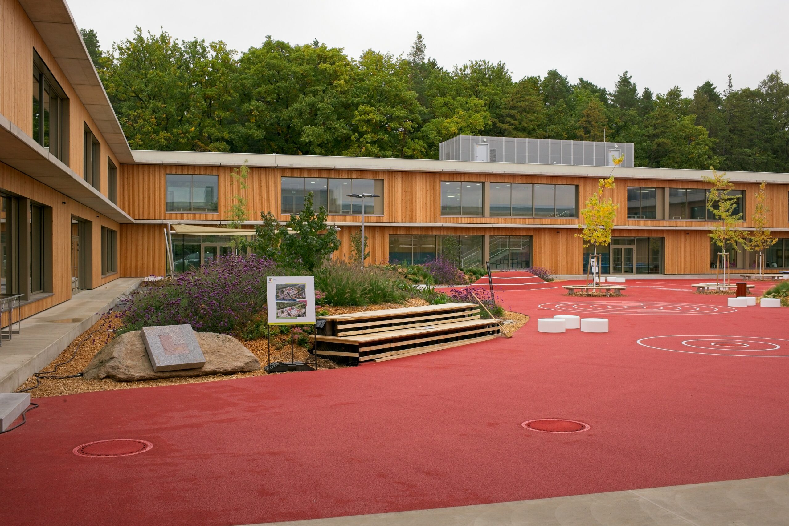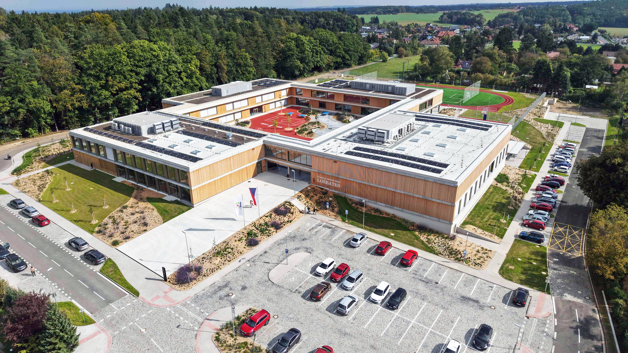 Čtyři moderní budovy – tělocvična, knihovna, ateliér i cvičná kuchyně. Díky zeleným střechám, fotovoltaice a chytrému řízení energií je LOŠBATES i příkladem udržitelné stavby.