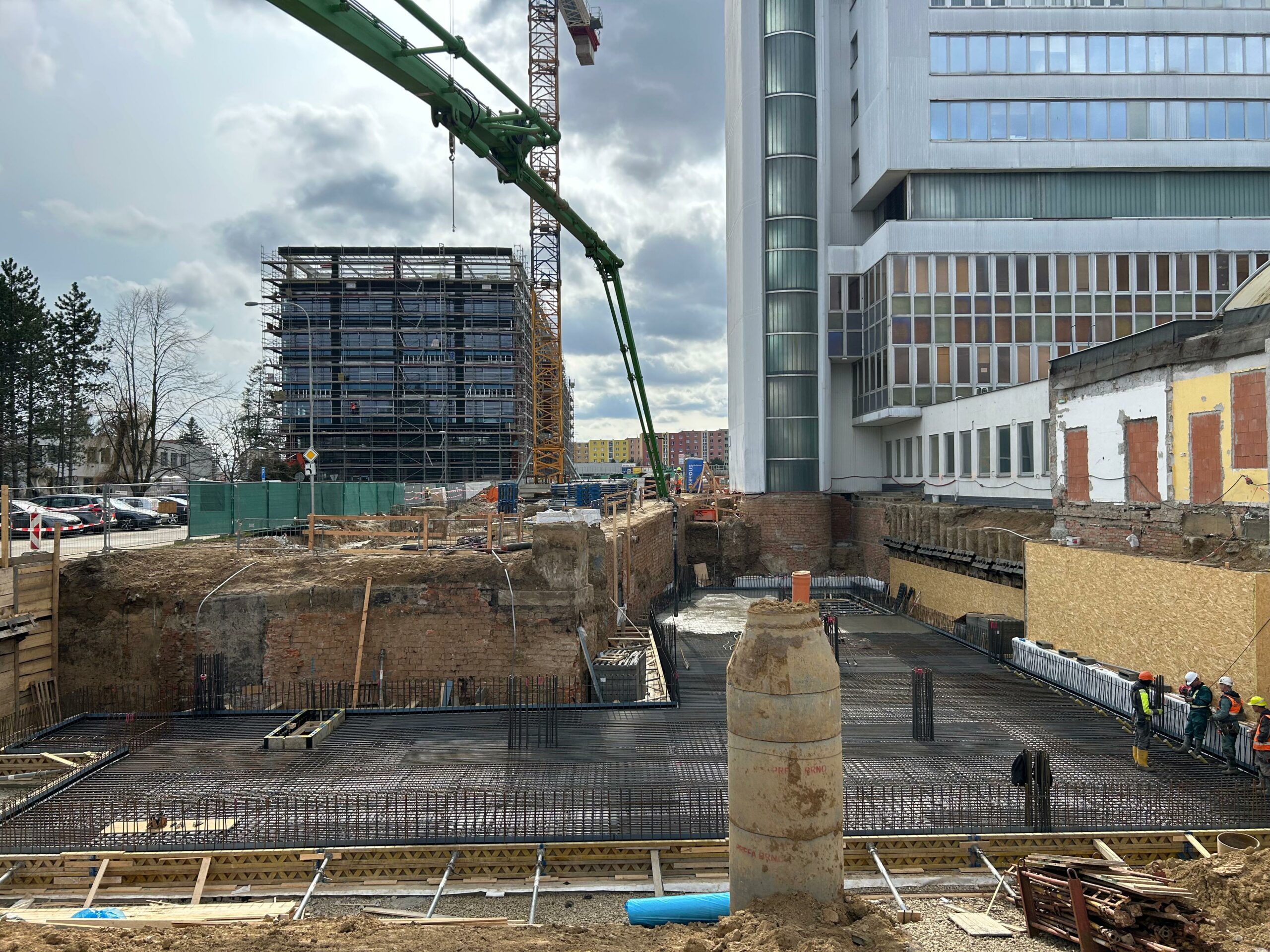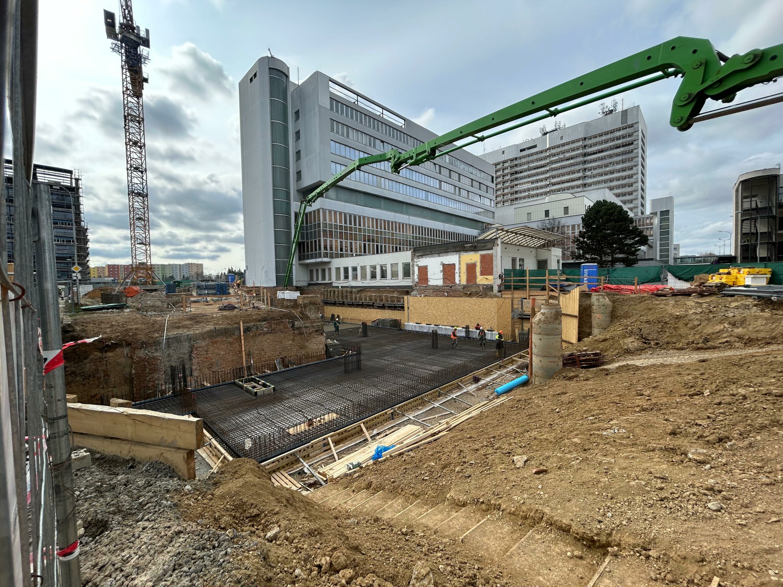 Zcela nový pětipodlažní pavilon částečně nahradí již neexistující budovy, které v bohunickém areálu ustoupily demolici. Stavbu provádíme od loňského září a její dokončení plánujeme příští rok v březnu.